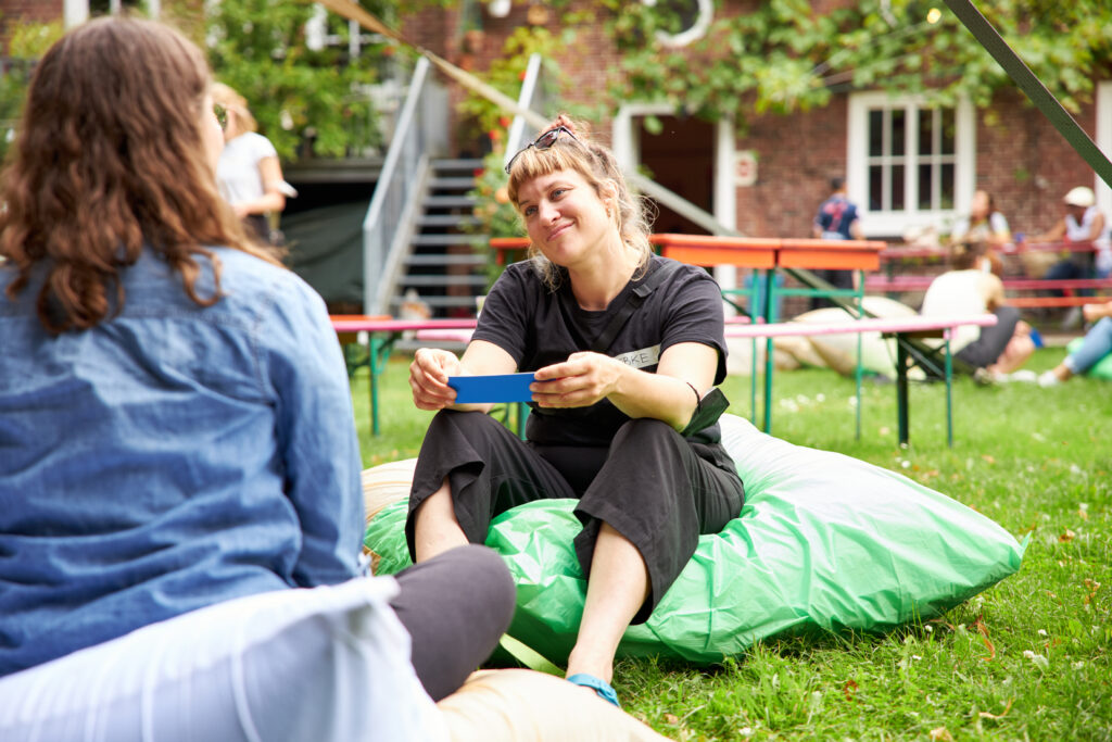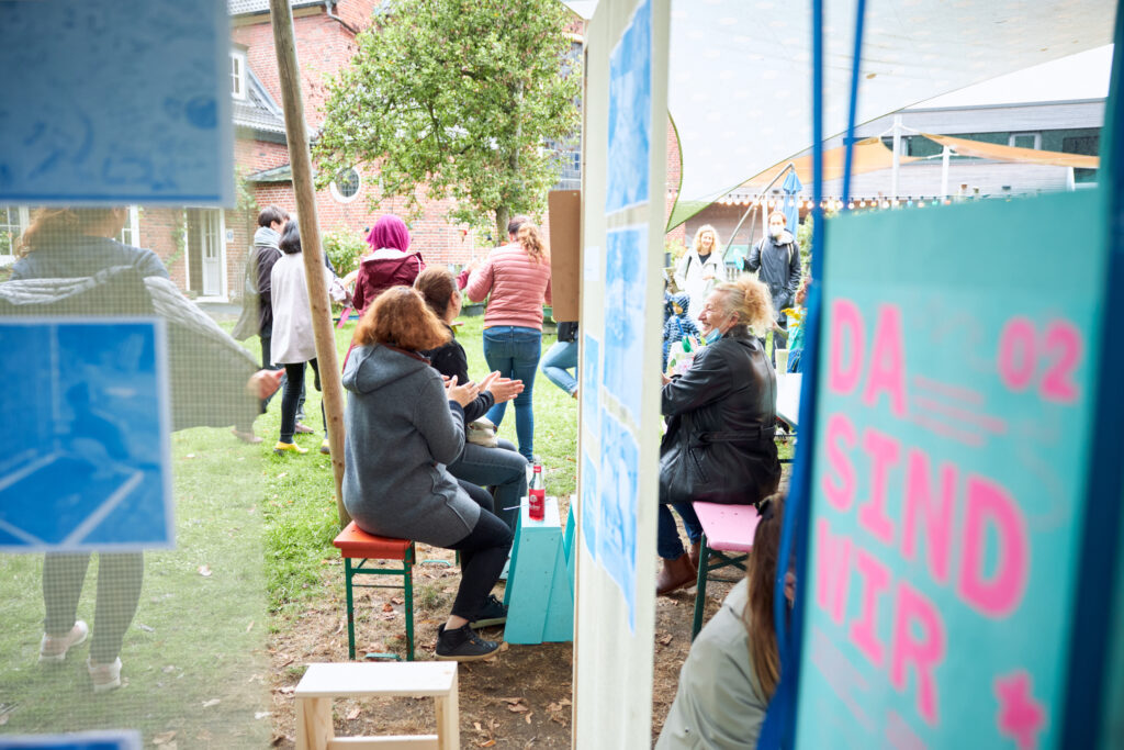 DA SIND WIR* 02 fand im August 2021 im Hamburger Stadtteil Veddel in Kooperation mit dem Begegnungsort »Kulturkirche Café Nova / NEW HAMBURG« und der »Poliklinik Veddel« statt. Die zweite Edition richtete sich in den Workshops vor allem an auf der Veddel lebende erwachsene Frauen. Über den Zeitraum von drei Wochen wurde gemeinsam der öffentlichen Raum erkundet und hinterfragt und daran anschließend Zukünfte imaginiert und sichtbar gemacht. Das Projekt beinhalteet neben drei aufeinander aufbauenden Workshops ein kostenloses, für alle zugängliches Begleitprogramm und endete mit einer öffentlichen Abschluss-Veranstaltung.