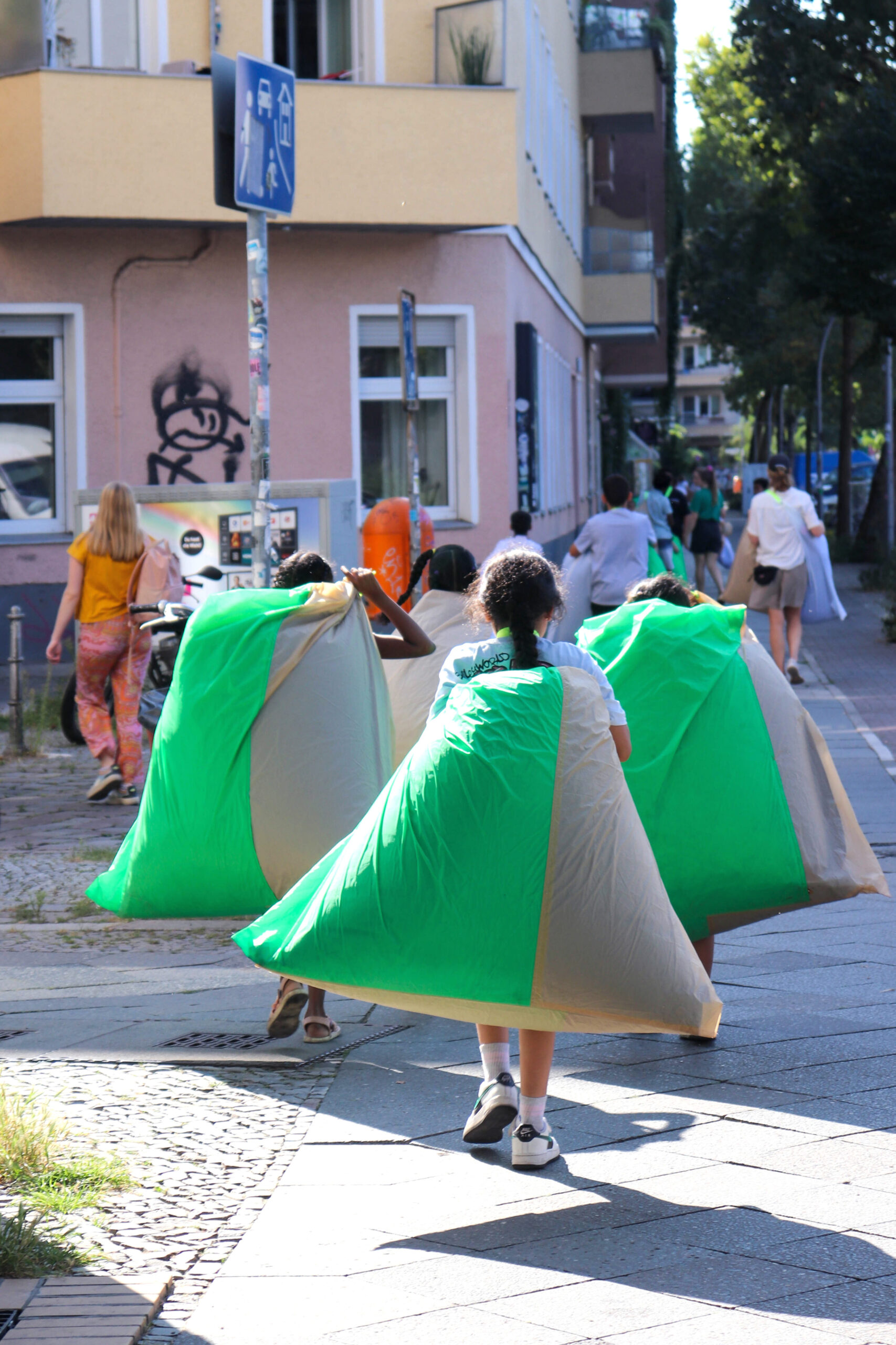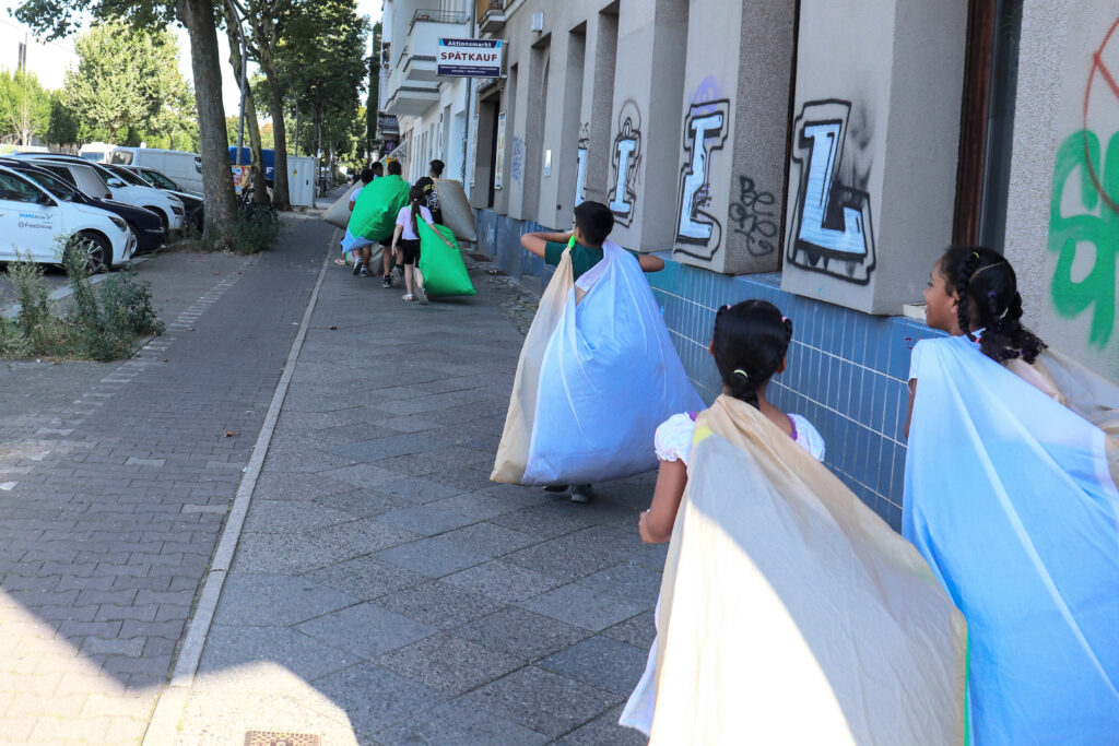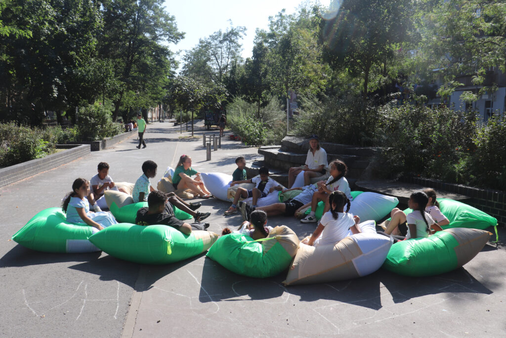 Es ist Sommer in Berlin, Ferien, morgens schon spürt man, dass es heiß wird am Tag. Mitten in Moabit sind wir eine bunte Gruppe mit riesengroßen Luftkissen. Wir bewegen uns durch die Straßen rund um das SOS-Kinderdorf, mal langsam, mal schnell, bleiben stehen, verstecken uns hinter den Kissen und chillen auf der Straße. Aufgeregt, sichtbar und selbstbewusst sind wir ein bunter Schwarm. Die Kissen rascheln, die Kids lachen. Es gibt einen ungewohnten Moment der Ruhe für alle, die mitten auf der Straße sitzend oder liegend auf ihrem Kissen fläzen und mit geschlossenen Augen Geräuschen nachgehen. Ein Fahrrad, die S-Bahn, ein Vogel …